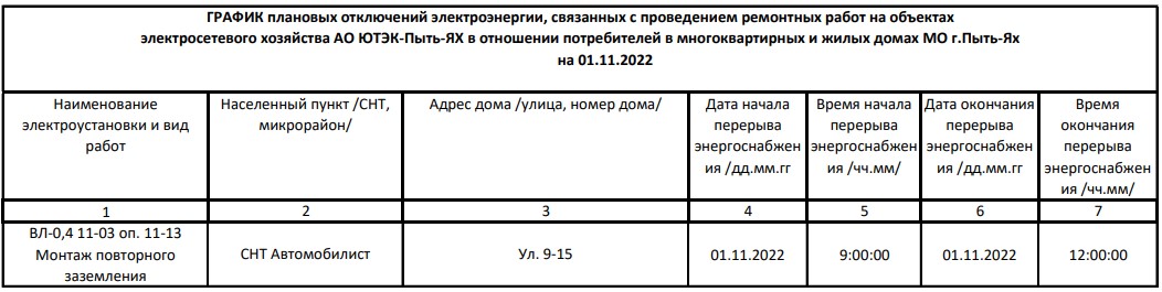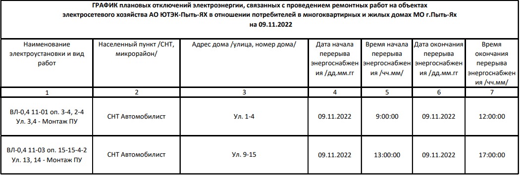 Плановые отключения на 09.11.2022