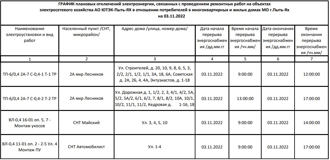 Плановые отключения на 03.11.2022