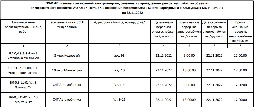 Плановые отключения на 22.11.2022